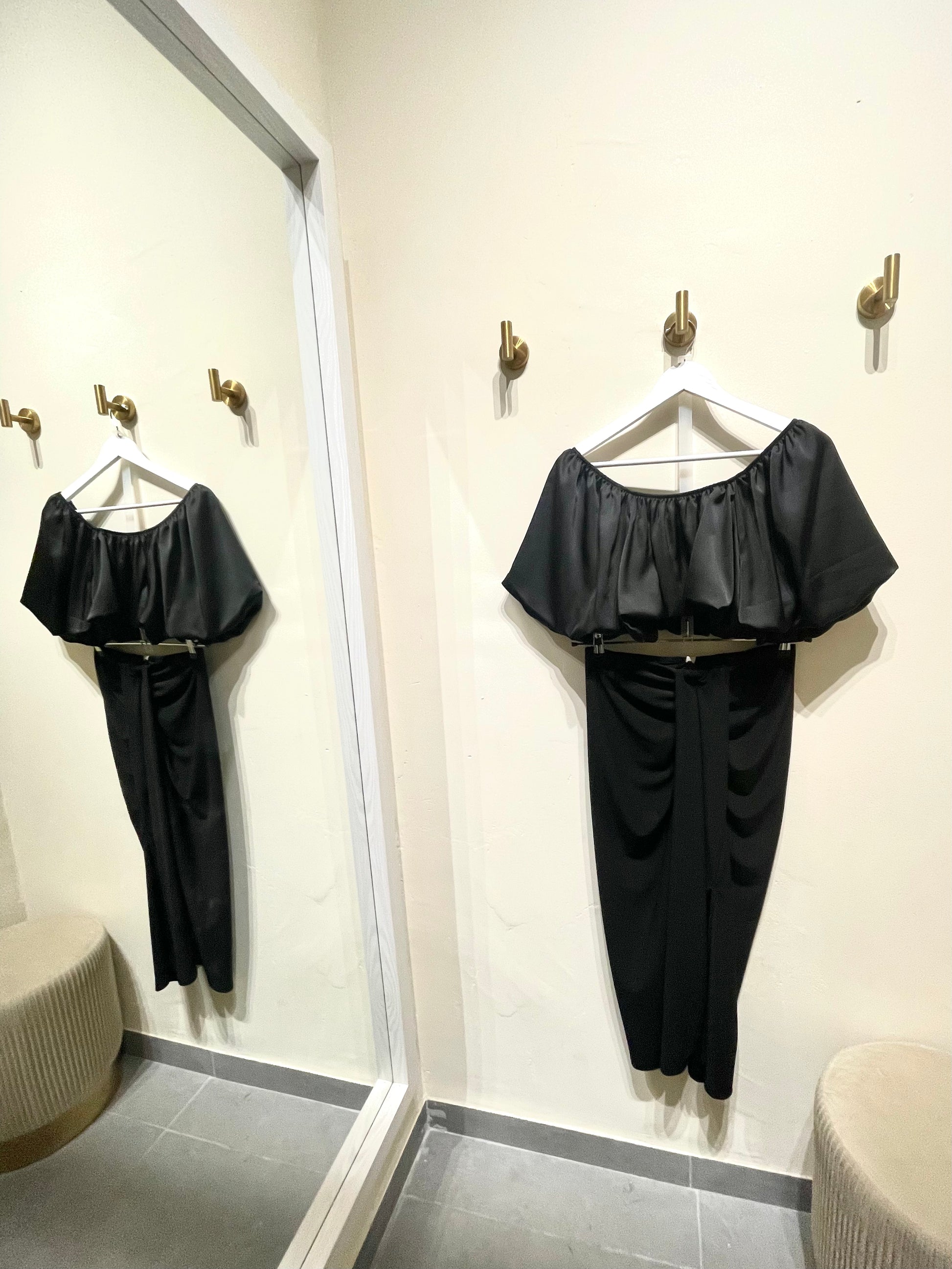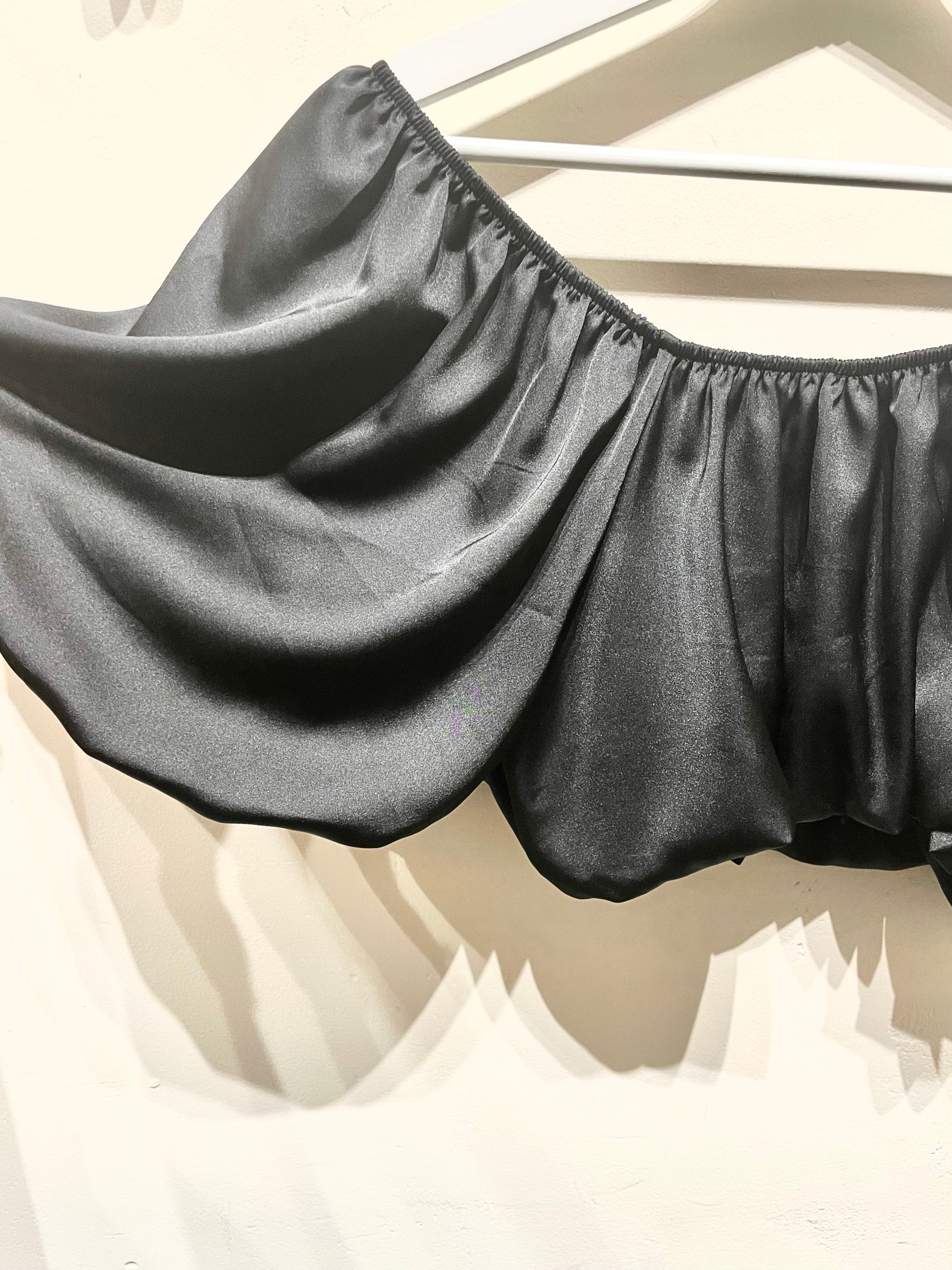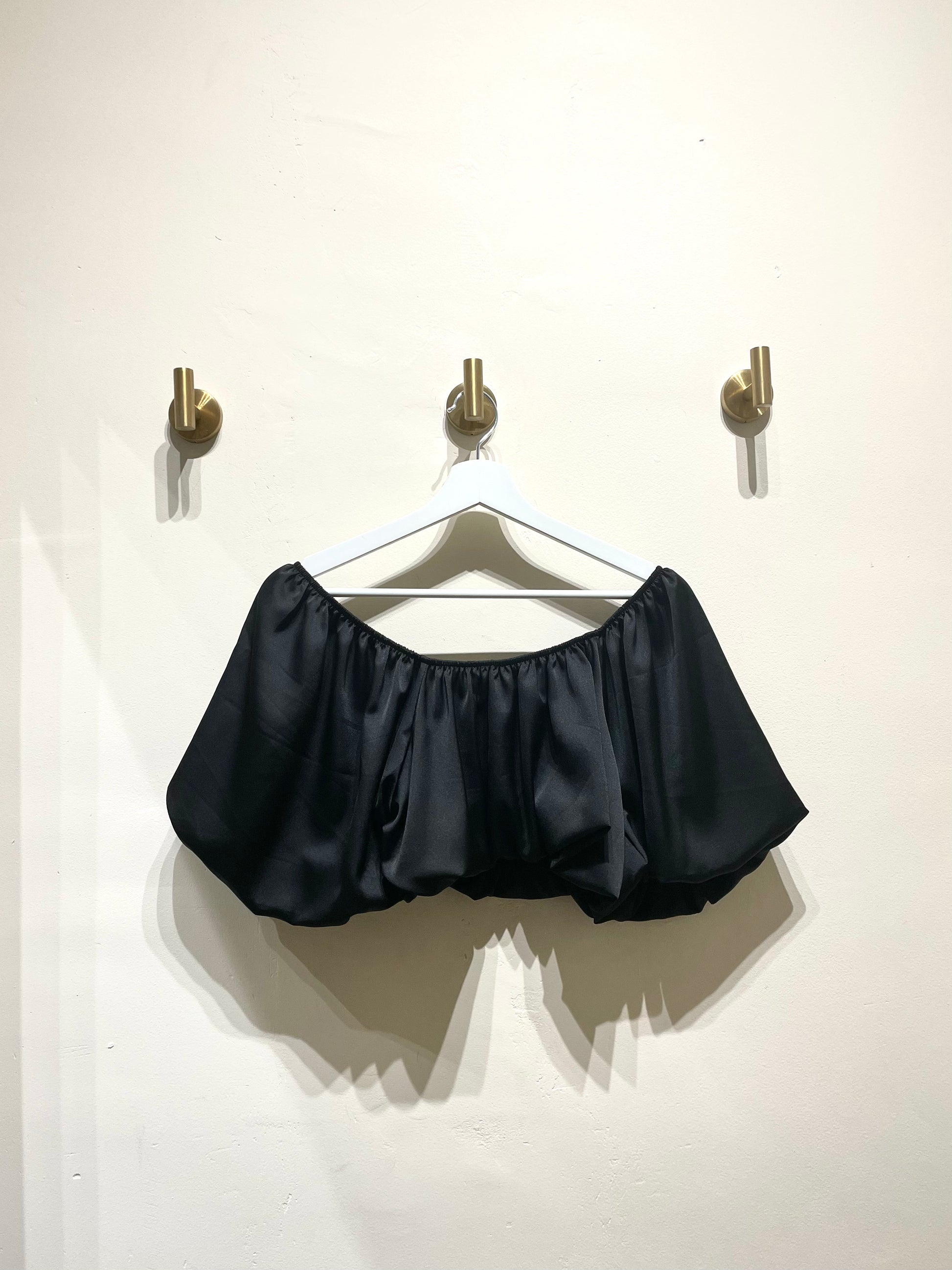 Blusa crop abullonada de tejido satinado, con goma adaptable.