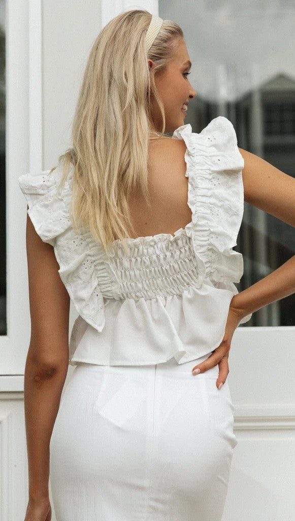 Blusa de popelín calado y engomado. Con estructura de volantes.